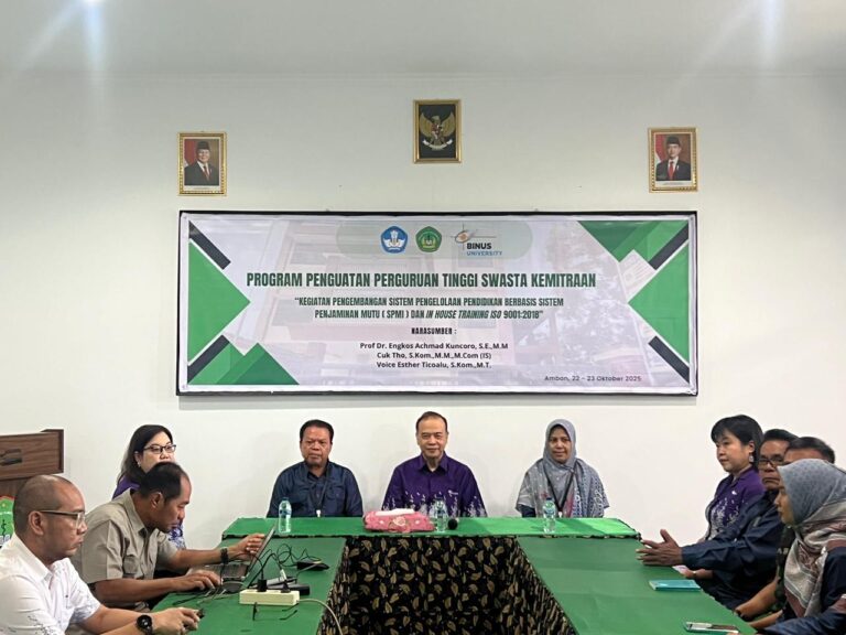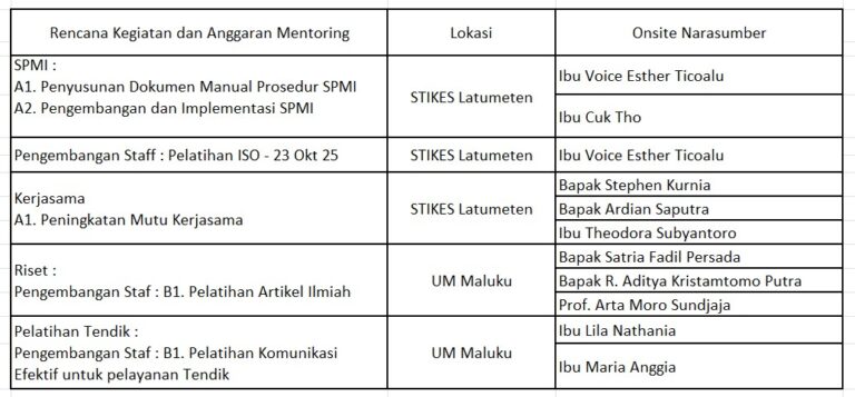 Program ini berjalan dengan diawali dengan kegiatan pendampingan dari Mentor, yaitu BINUS University kepada para Mentee di STIKES RS Prof. Dr. J.A. Latumeten dan UMM Maluku dari tanggal 19 Oktober – 23 Oktober 2025, yang dibawakan oleh team internal dari BINUS University yaitu: