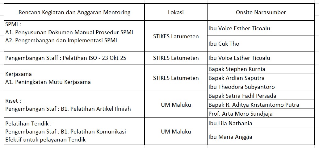 Program ini berjalan dengan diawali dengan kegiatan pendampingan dari Mentor, yaitu BINUS University kepada para Mentee di STIKES RS Prof. Dr. J.A. Latumeten dan UMM Maluku dari tanggal 19 Oktober – 23 Oktober 2025, yang dibawakan oleh team internal dari BINUS University yaitu: