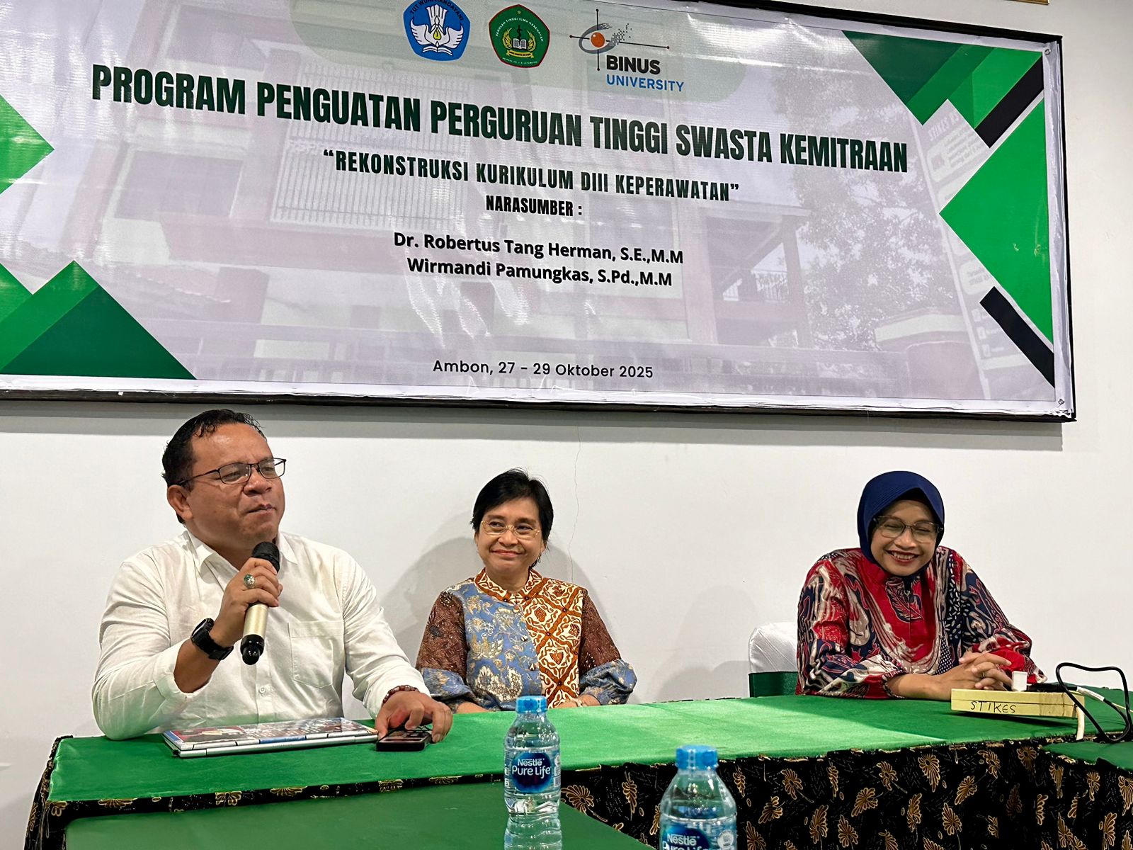 Program ini berjalan dengan diawali dengan kegiatan pendampingan dari Mentor, yaitu BINUS University kepada para Mentee di STIKES RS Prof. Dr. J.A. Latumeten dan UMM Maluku dari periode 26 Oktober – 01 November 2025, yang dibawakan oleh team internal dari BINUS University yaitu: